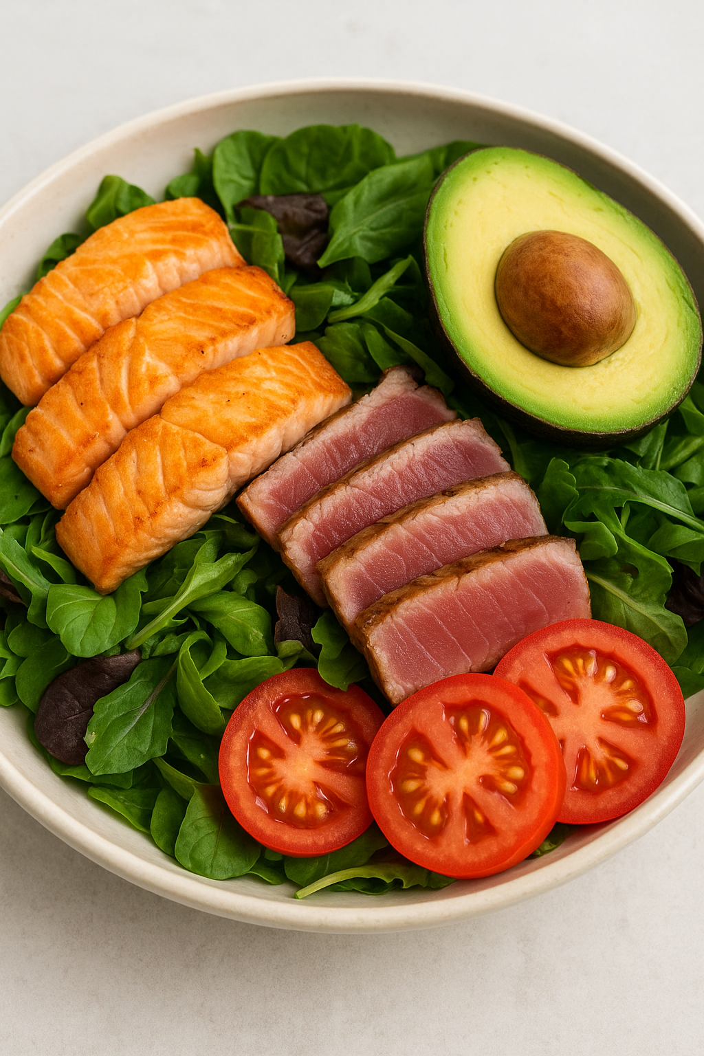 120. Salade aux saumon et thon grillé avec avocat (3, 4, 6)